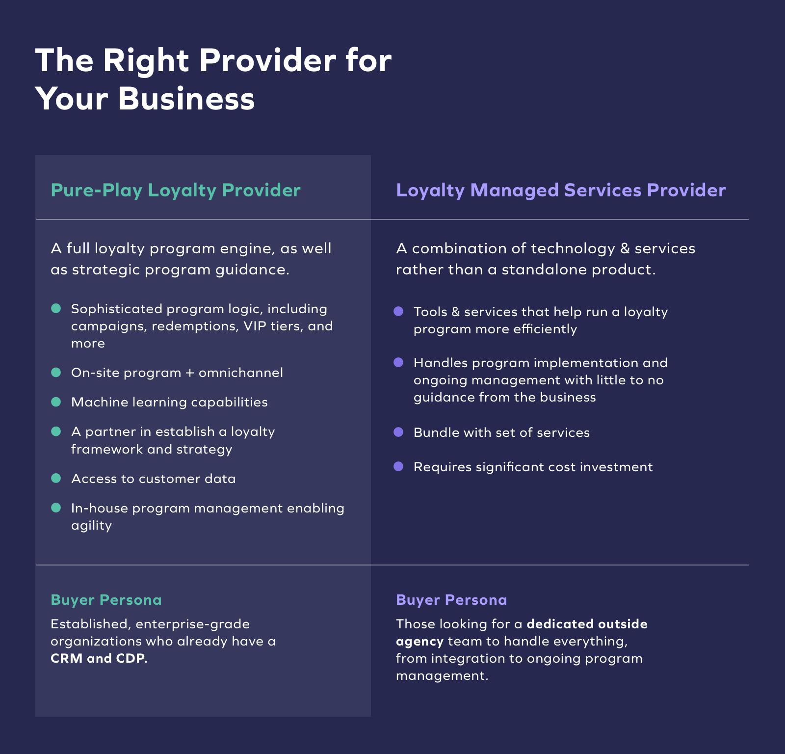 A loyalty managed services provider is recommended for in-house teams that lack the bandwidth or expertise to build and manage their own loyalty solution. A services provider is ideal for an organization that prefers an outsourced solution and does not plan to leverage the customer data to enhance their loyalty program or other marketing channels. A services provider is a solution for a business that has no need to interact with or manage the program in an agile, personalized way.