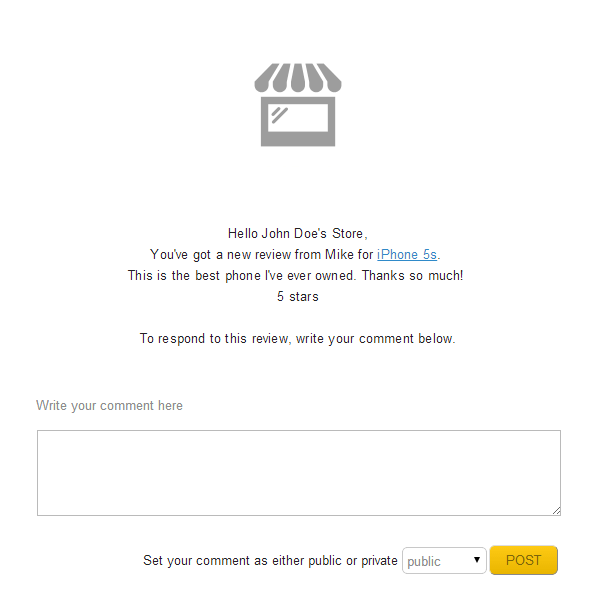 In the email there is also a drop down button, allowing you to send the comment publicly or privately. If you choose to submit the comment privately then our system will email the reviewer the comment and no comment will be shown on your website. If you choose “public” and the review has been published on your site, then the comment will appear in the reviews widget on your site.