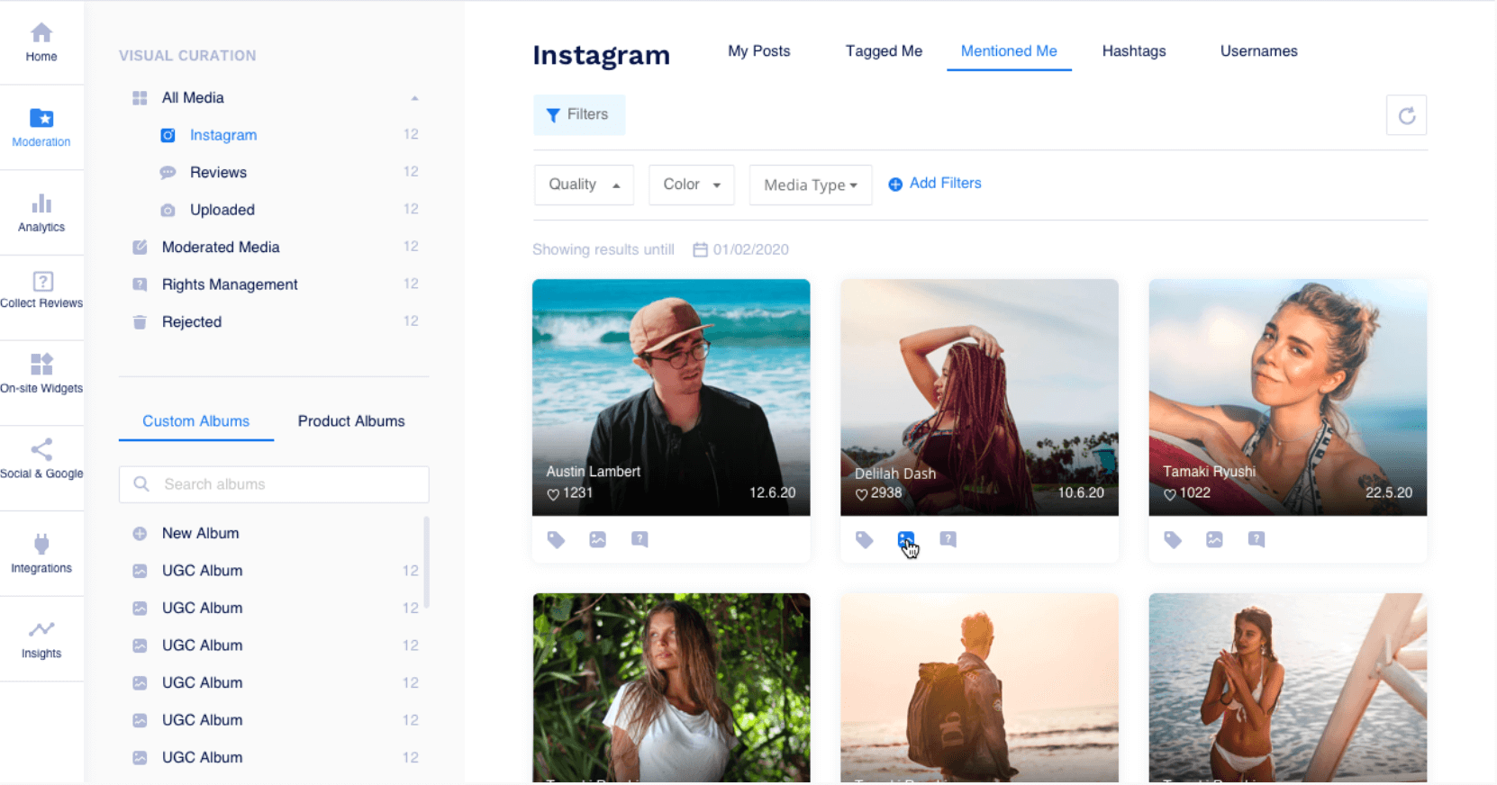 - Redesigned Curation Page: We updated the look and feel of the Curation Page to include bigger photo thumbnails in gallery-style grids, Quick Action Buttons to facilitate easier bulk actions, and individual Instagram post likes to highlight top-performing posts, so your brand can curate on-brand images quicker and easier than ever.