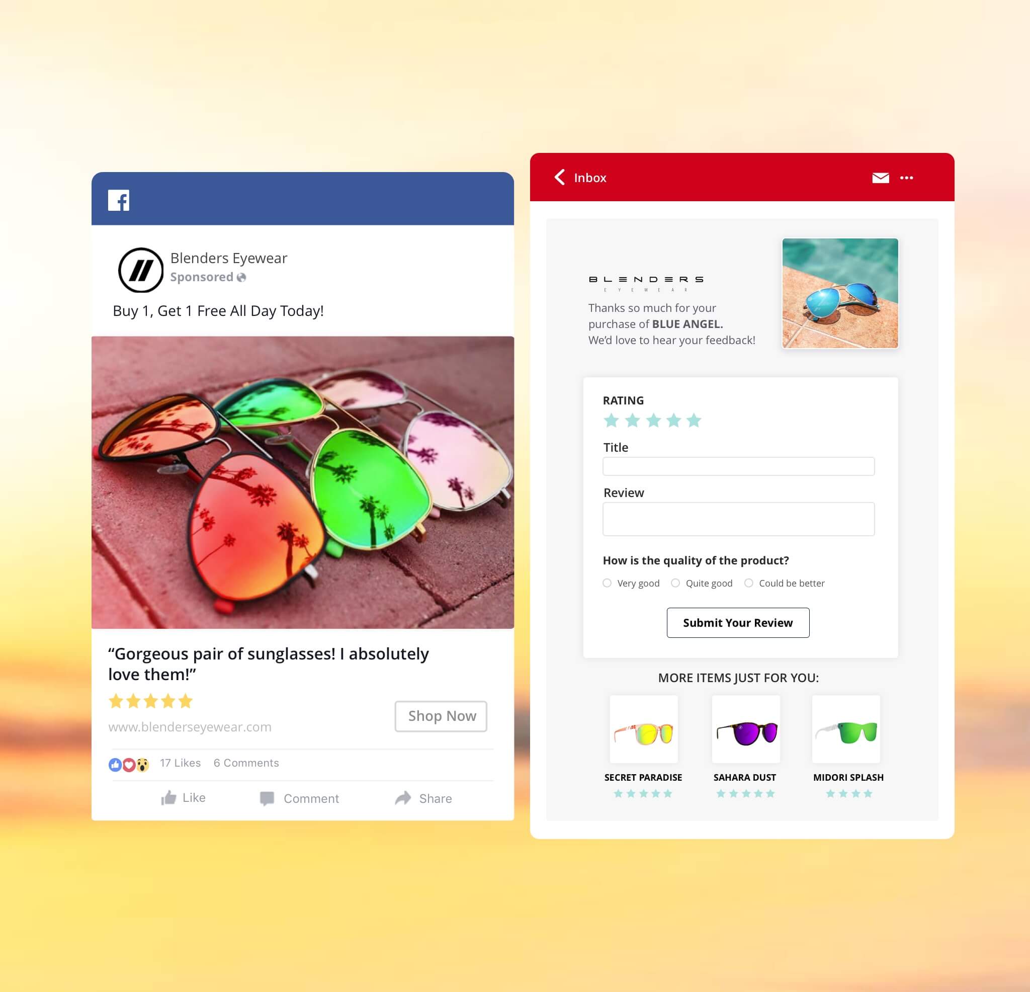 Chase recognized the importance of customer content early on: “I looked to the Amazons of the world as an example, and saw that everything was built on reviews.” He decided to get Yotpo, initially just for customer reviews, star ratings, and commenting. He immediately saw the impact on customer engagement, community, and conversions, but he knew that to continue to grow, Blenders needed a solid strategy for using customer content to sell on social.