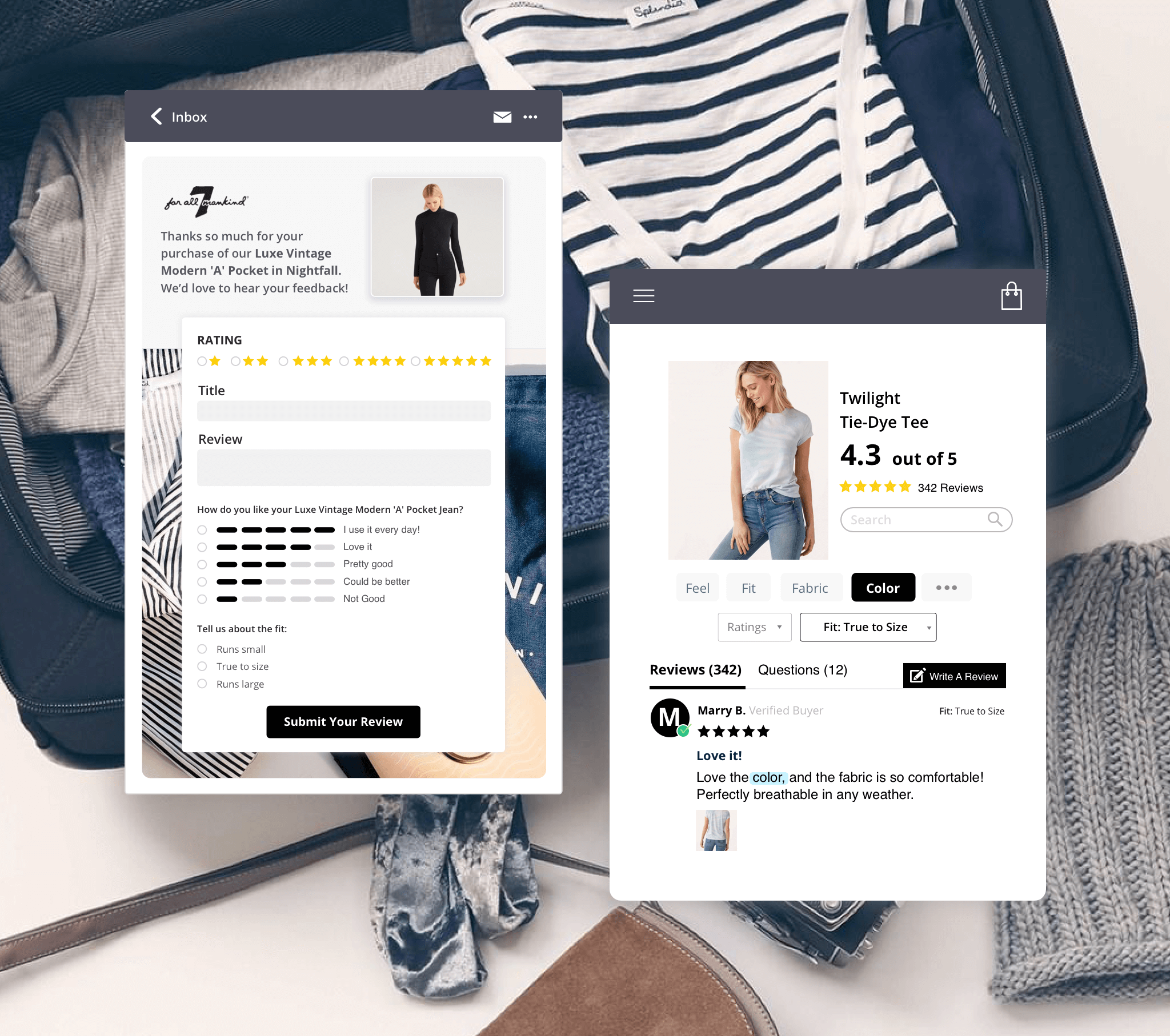 To ensure that 7 For All Mankind and Splendid’s brand voice and aesthetic stayed at the forefront, Yotpo worked with Delta Galil to customize the look and feel of the reviews widget, as well as the overall functionality. The solution prioritized custom review questions that match their respective product category, and it created a more seamless experience than the previous reviews solution. For 7 For All Mankind, fit is a huge factor for shoppers, and fit-related review filters complement a Fit Guide that Corra created for the brand.