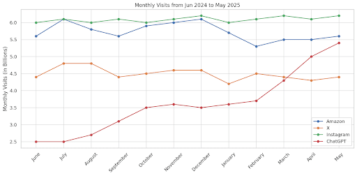 Take a look at ChatGPT’s total visits compared to Amazon, X, and IG. It’s been skyrocketing at a pretty insane rate.