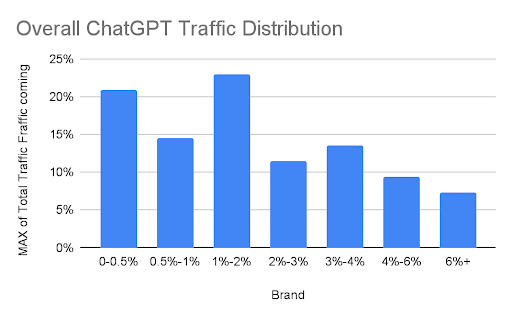 When we looked at ChatGPT traffic across brands, it wasn’t even close. Over 50% of brands get under 2% of traffic from ChatGPT. 20% get under 0.5%. Only 7% break 6%.