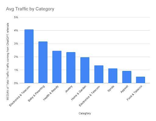 - Electronics leads with a 4%+ share. Shoppers ask AI to compare specs.