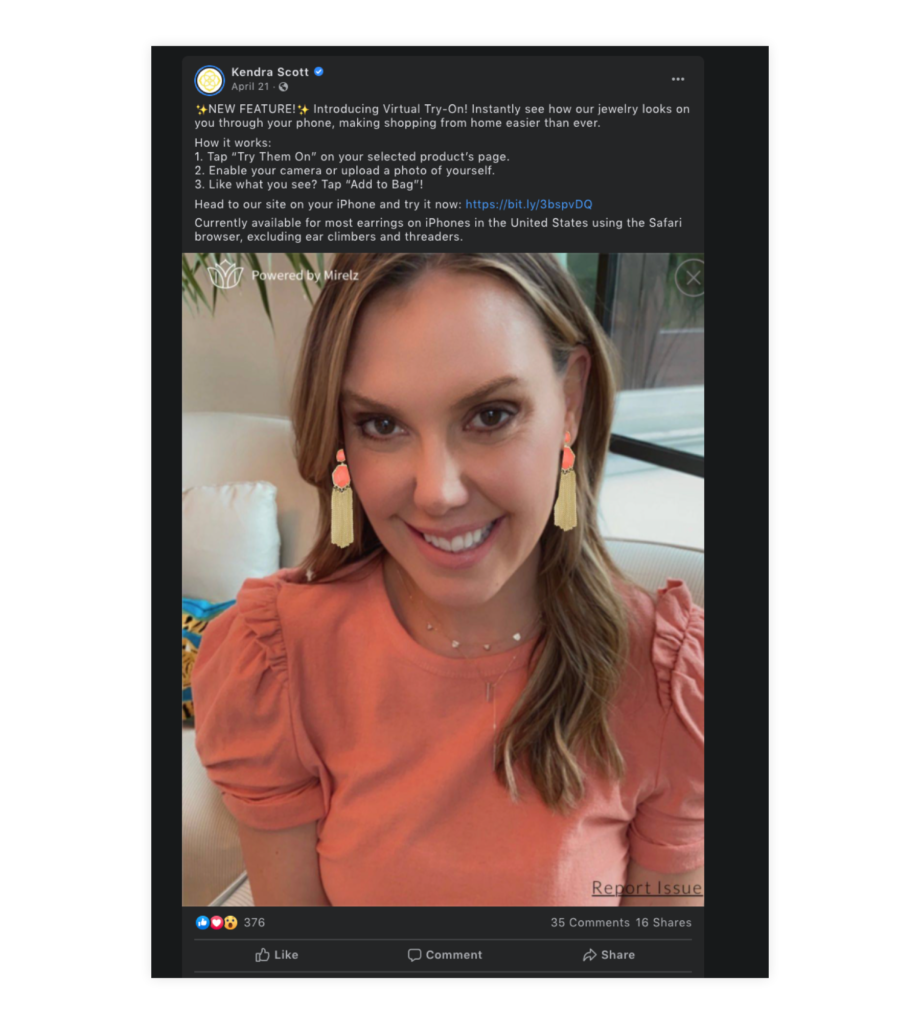 Look to the brands who have tackled this challenge by creating virtual experiences meant to replicate what customers would expect when shopping in-person. After COVID-19 forced them to shut down their physical store locations in March, jewelry brand Kendra Scott rolled out a “Virtual Try-On” feature, where shoppers can use the camera on their phone to see how products would look on them in real life. In a similar vein, with customers unable to shop in-person, underwear brand Knix began offering virtual bra fittings via Google Hangouts.