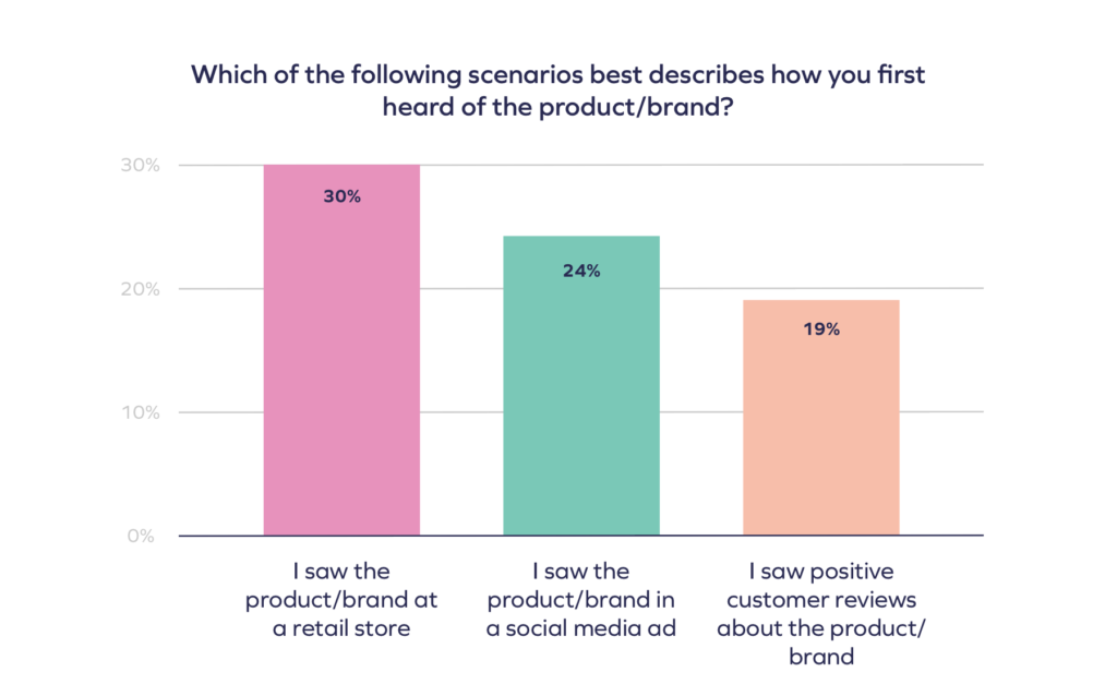 When asked how they first heard of a new product/brand, 30% of survey respondents answered, “I saw it at a retail store.” As the data shows, many of your potential customers rely heavily on third-party retailers when it comes to buying from a brand for the first time, and will deliberately start their search at a trusted favorite like Target, Walmart, Sephora, Neiman Marcus, and more.