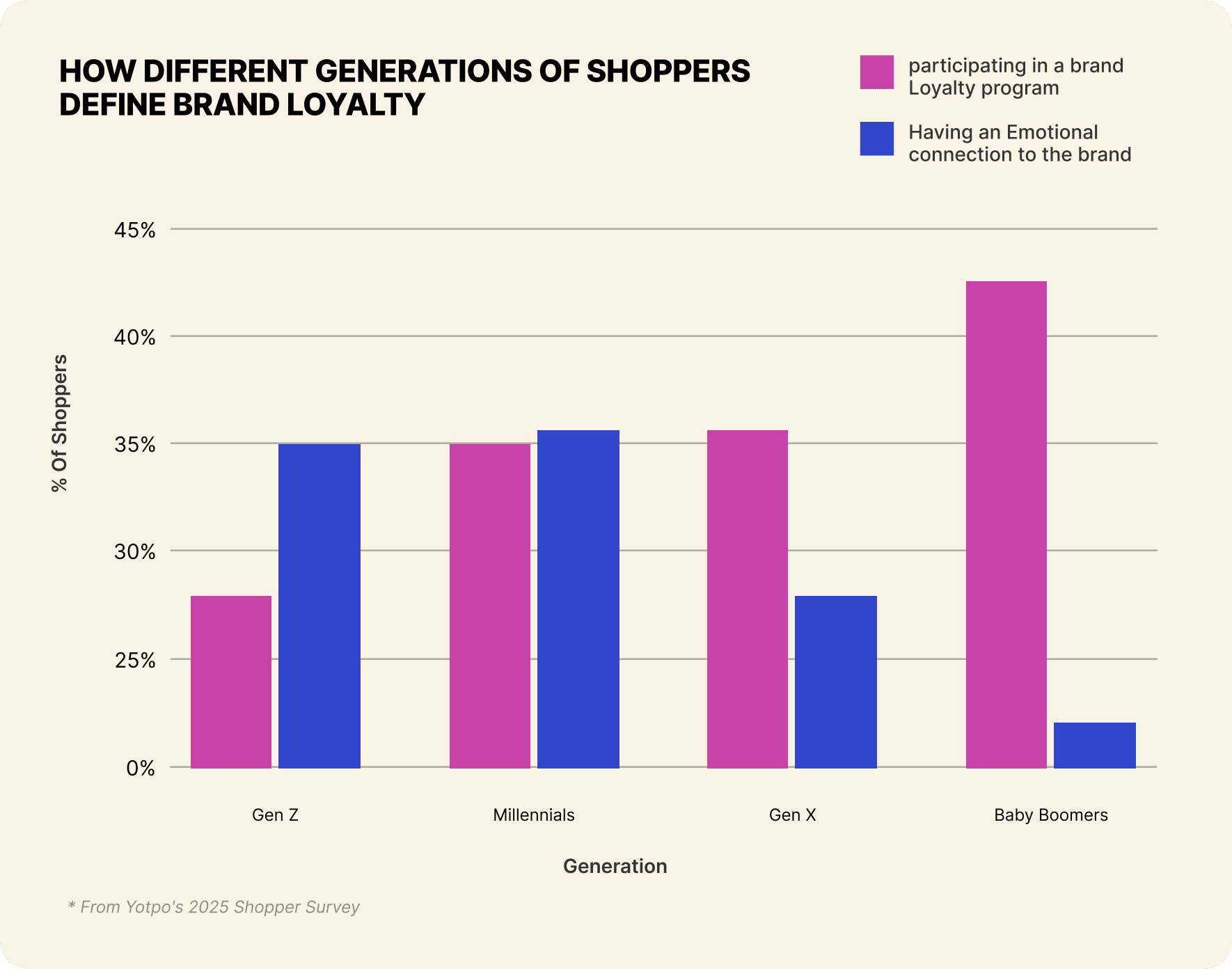 How shoppers define loyalty also depends on age. The younger generation of consumers, especially Gen Z, typically experience loyalty as an emotional connection first. For them it’s about identity, values and community. Loyalty is felt before it’s formalized through a program. The older generations are much more likely to see loyalty as enrollment in a program. For them perks, points and structure validate their commitment.