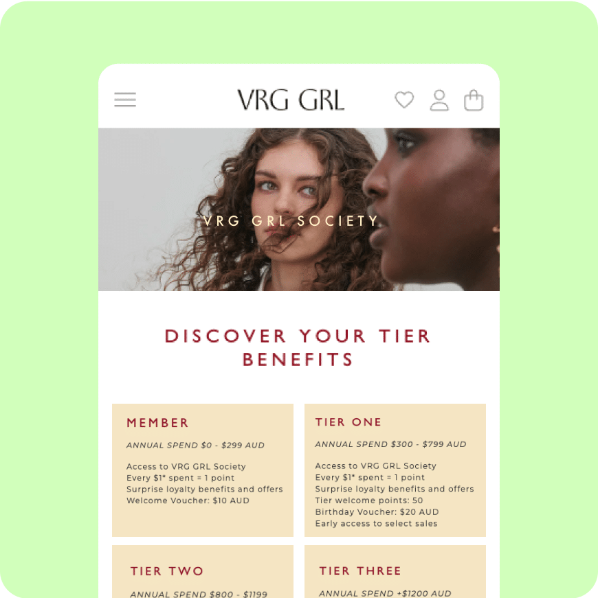 VRG GRL rebuilt its VRG GRL Society benefit model to deliver exactly what members asked for: welcome vouchers, early access, free shipping, seasonal gifts, and exclusive previews.