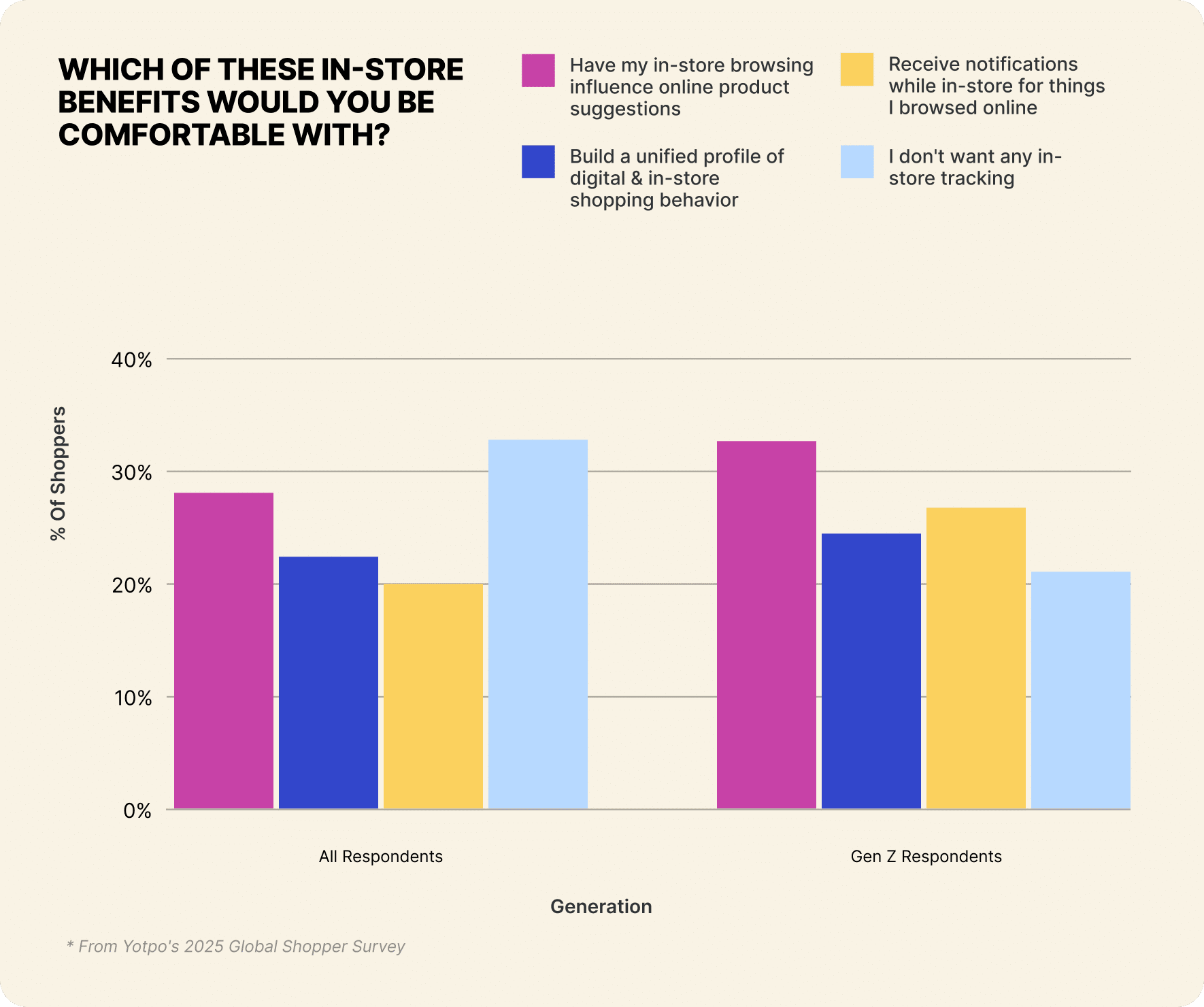 Only 21% of Gen Z say “no tracking” compared to the 33% overall. The generation that grew up with smartphones expects brands to remember them everywhere, including in physical stores.