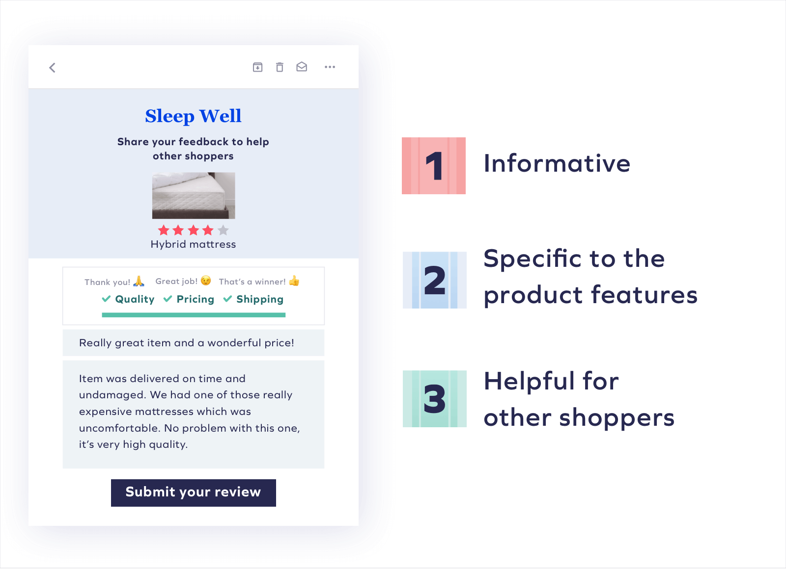 The more detailed the customer reviews, the more helpful they’ll be to those who are reading them. Instead of an open-ended review request, asking customers specific questions can help you to solicit reviews that are higher in quality.