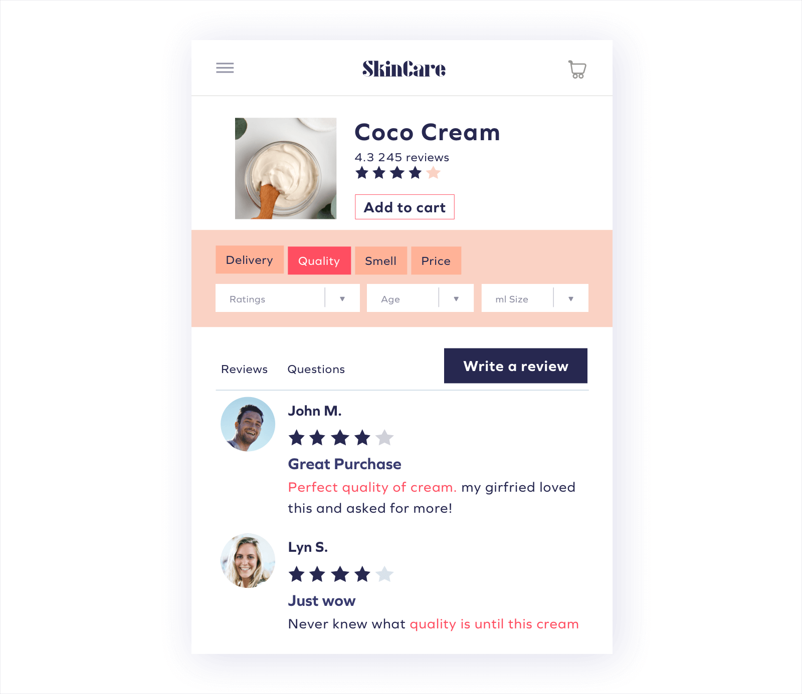 We’ve discussed how more reviews means more conversions, but how does a customer sort through all of them to find the information they need? If you have 100s of reviews for a product (lucky you!), a consumer isn’t going to read every single one, and may miss the one message that would lead them to checkout. That’s why having a way to sort and organize your reviews is so important.