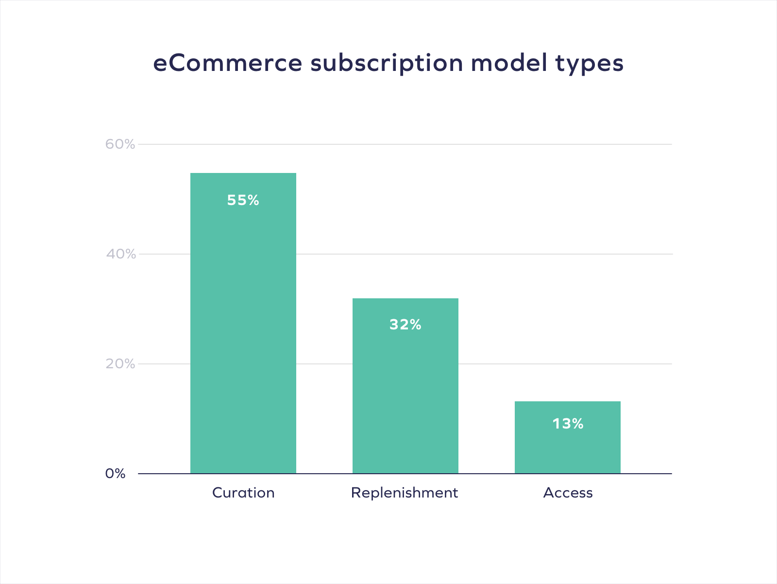According to McKinsey & Company, curation services are the most popular, with 55% of total subscriptions; replenishment accounts for 32% of subscriptions and access subscriptions for 13%.