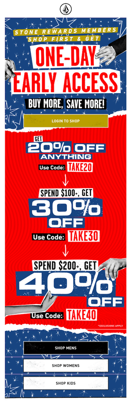 Programme de fidélité de Volcom, Stone RewardsAccess lance des campagnes d’accès anticipé pour les acheteurs à l’approche des jours fériés afin de les inciter à passer à l’action immédiatement. Une vente limitée à un jour suscite l’intérêt des Membres, et des remises échelonnées incitent à maximiser la valeur de la Commande.