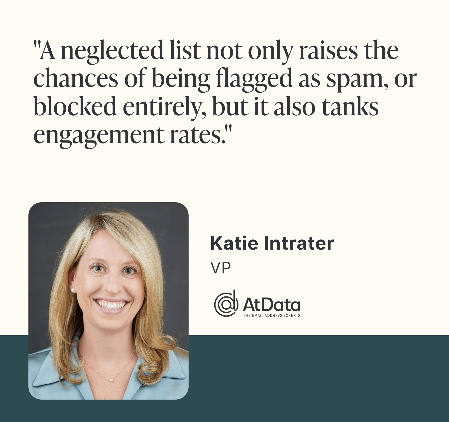 “Letting your email list fall into disrepair can have serious repercussions. A neglected list not only raises the chances of being flagged as spam, or blocked entirely, but it also tanks engagement rates. This can seriously harm your sender reputation and hinder your ability to reach even your most engaged subscribers. Think of list hygiene as your email campaign’s foundation – it’s not just a best practice, it’s essential for long-term deliverability success.” – Katie Intrater, VP of AtData
