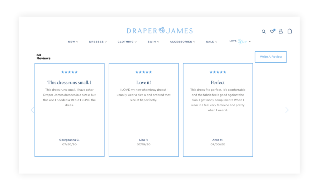 Draper James originally turned to Yotpo to use reviews to combat returns, since, “dresses are a product category that naturally has a bit of a higher return rate,” according to Helen Nightingale, the brand’s Director of eCommerce. Reviews would accompany the robust sizing and fit guide featured next to each dress on the Draper James site.