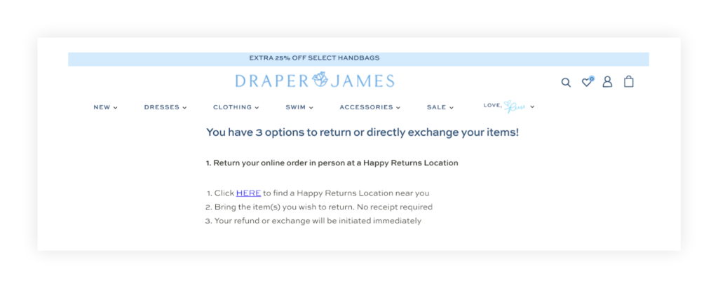 Draper James understands the importance of letting customers choose the returns option most convenient and best-suited to their needs. They offer three different options for returning or directly exchanging purchases — in person through Happy Returns, by mail, or in-store — greatly increasing the odds that a shopper will be able to find their preferred return method.
