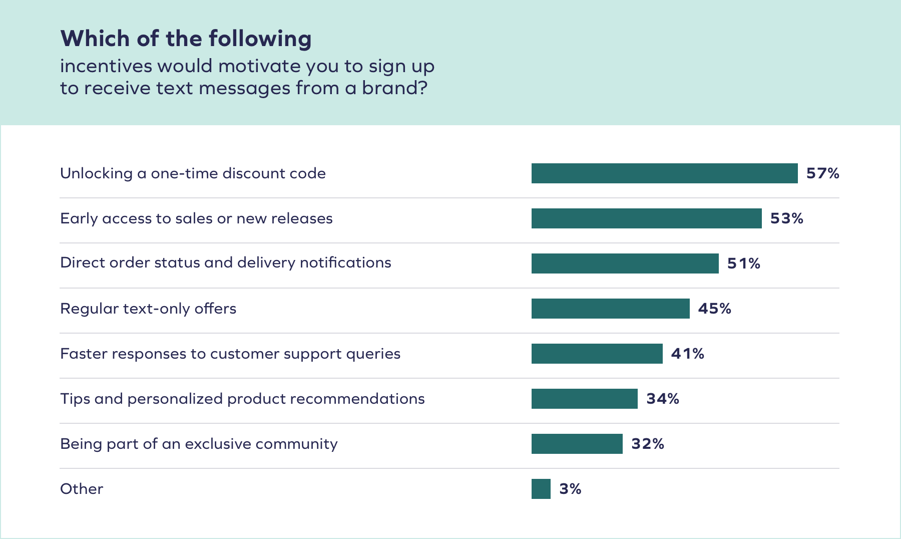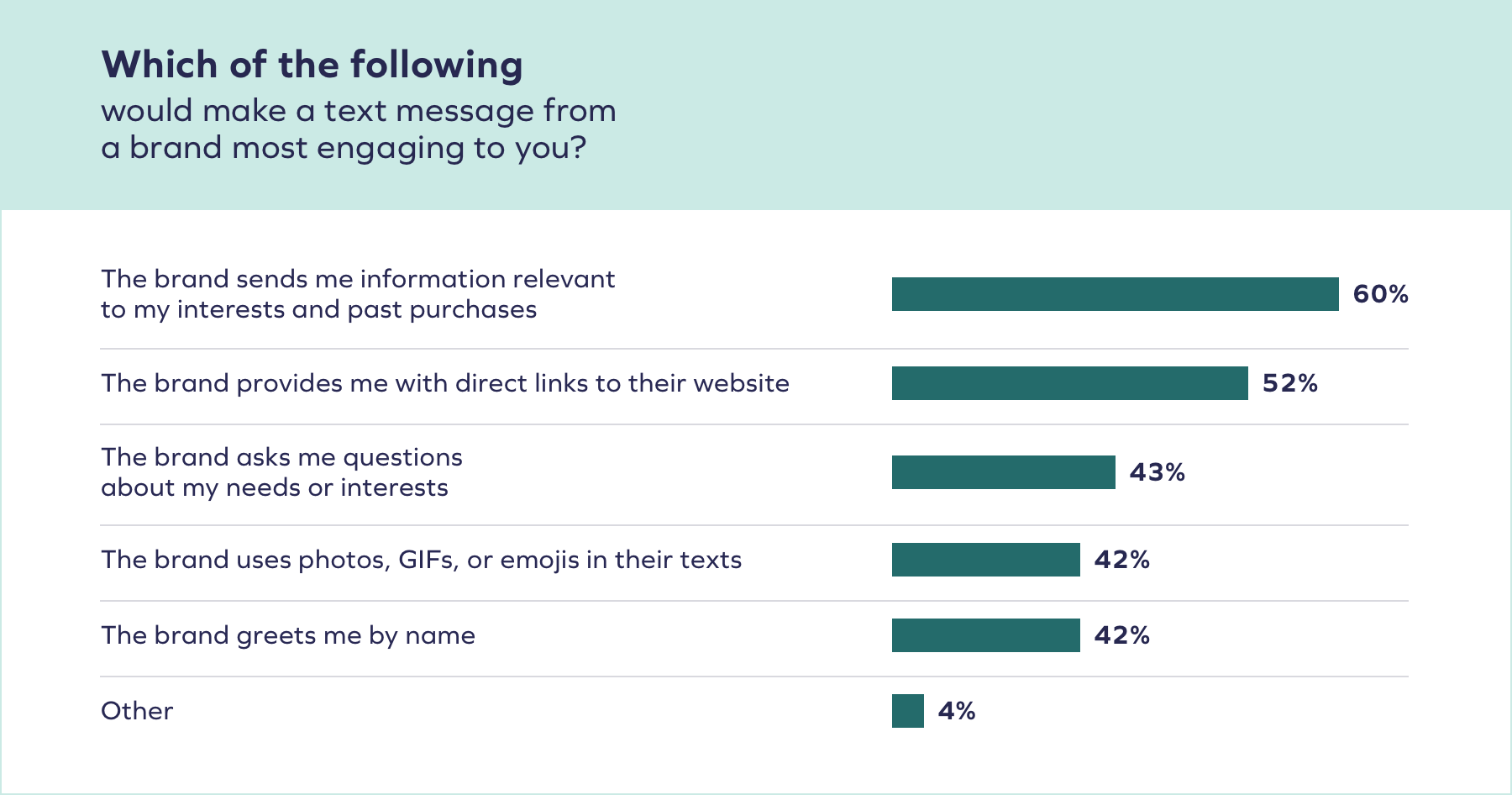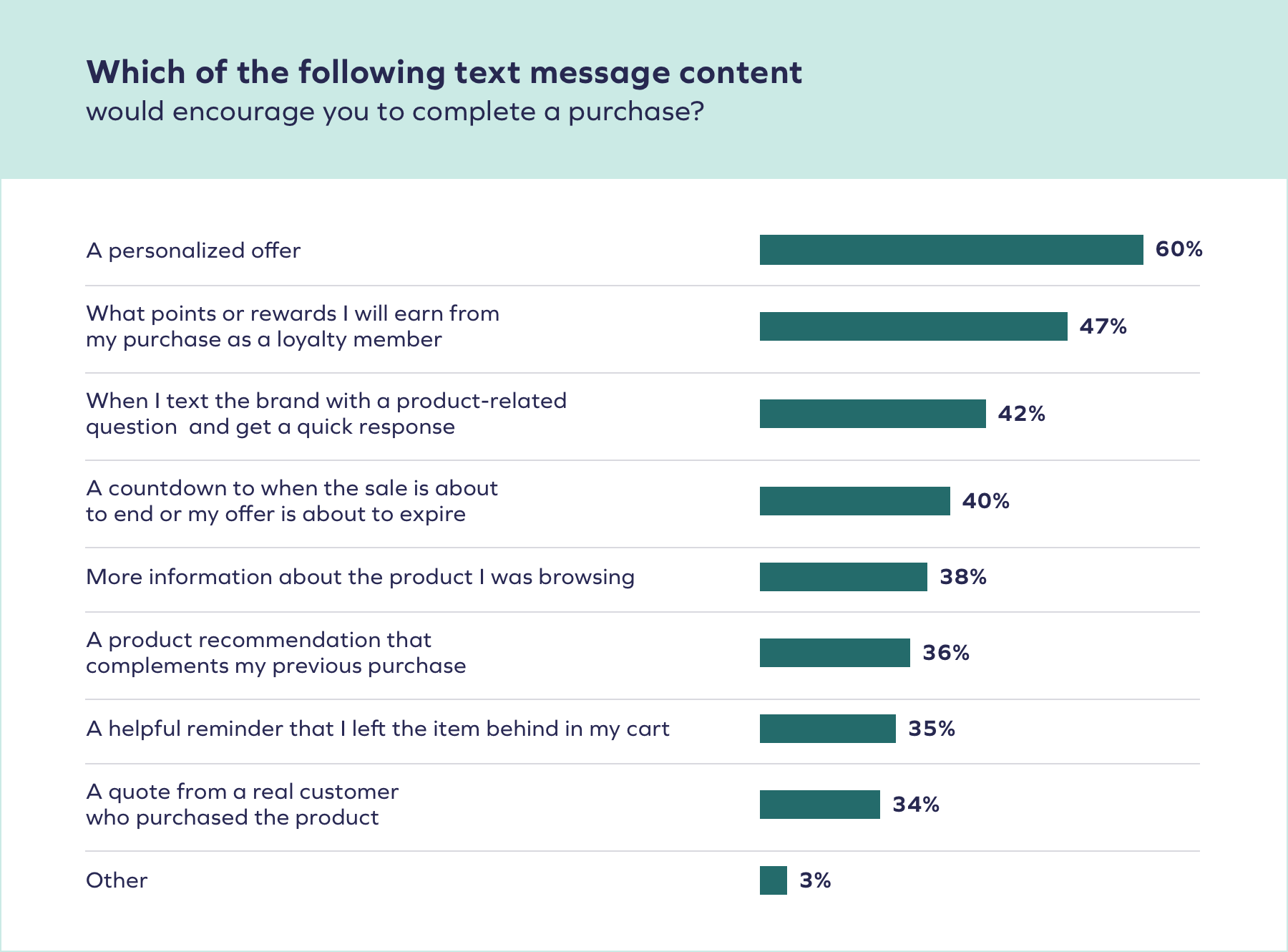 If you are not sure which channel to use for which message, you don’t have to guess which is best — let your subscribers decide. Send a text to ask them which messaging interests them the most, so you can segment accordingly. Consider prioritizing SMS for messages of high urgency that your customers need and want to know, like order status updates or limited time offers — 40% of shoppers said a text with a countdown to when a sale or offer expires would encourage them to complete a purchase.