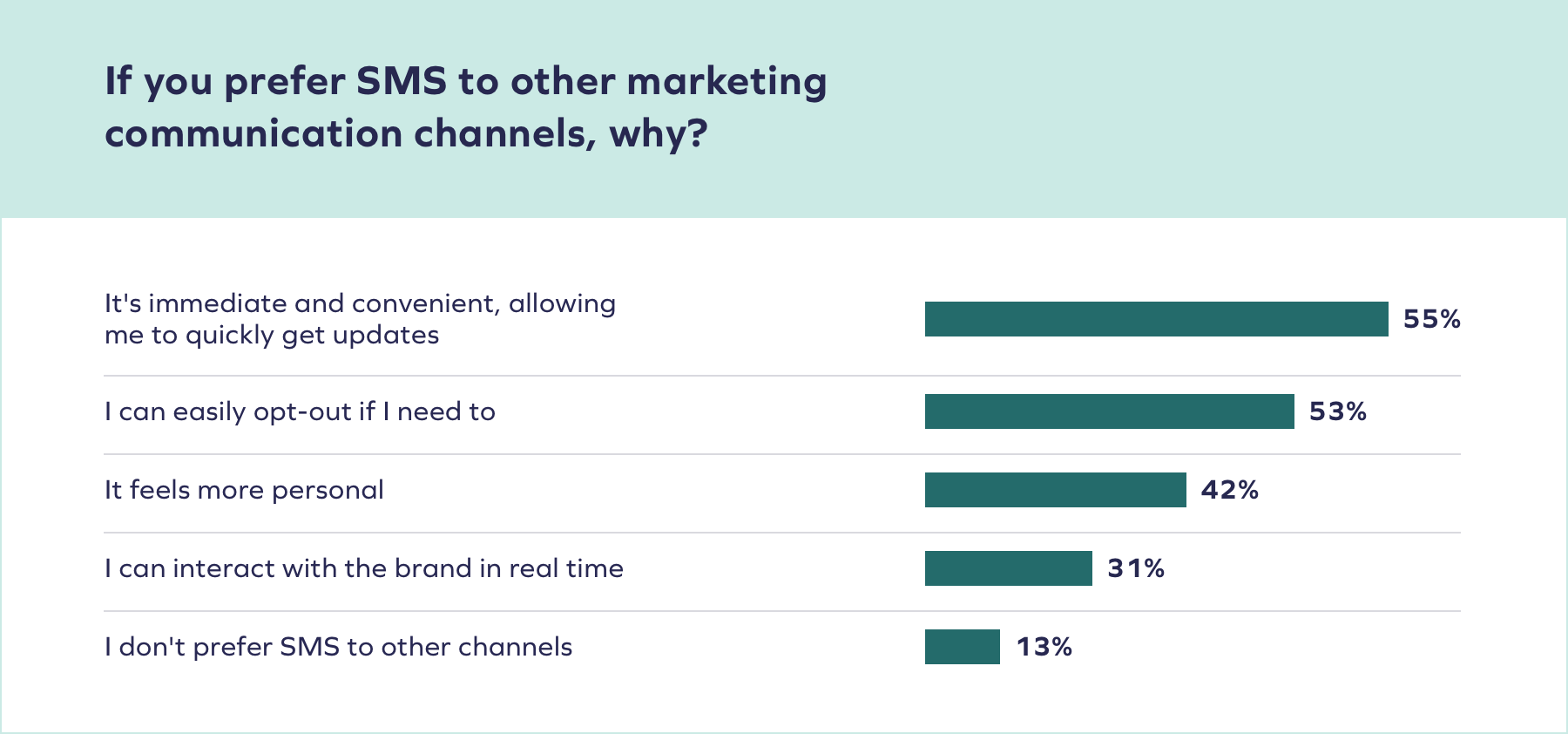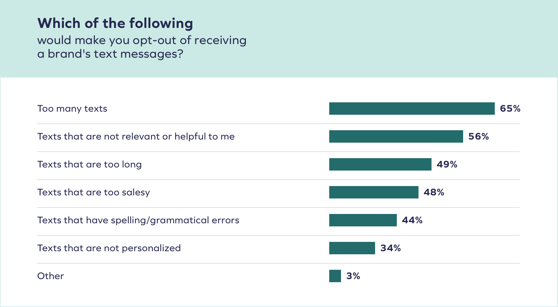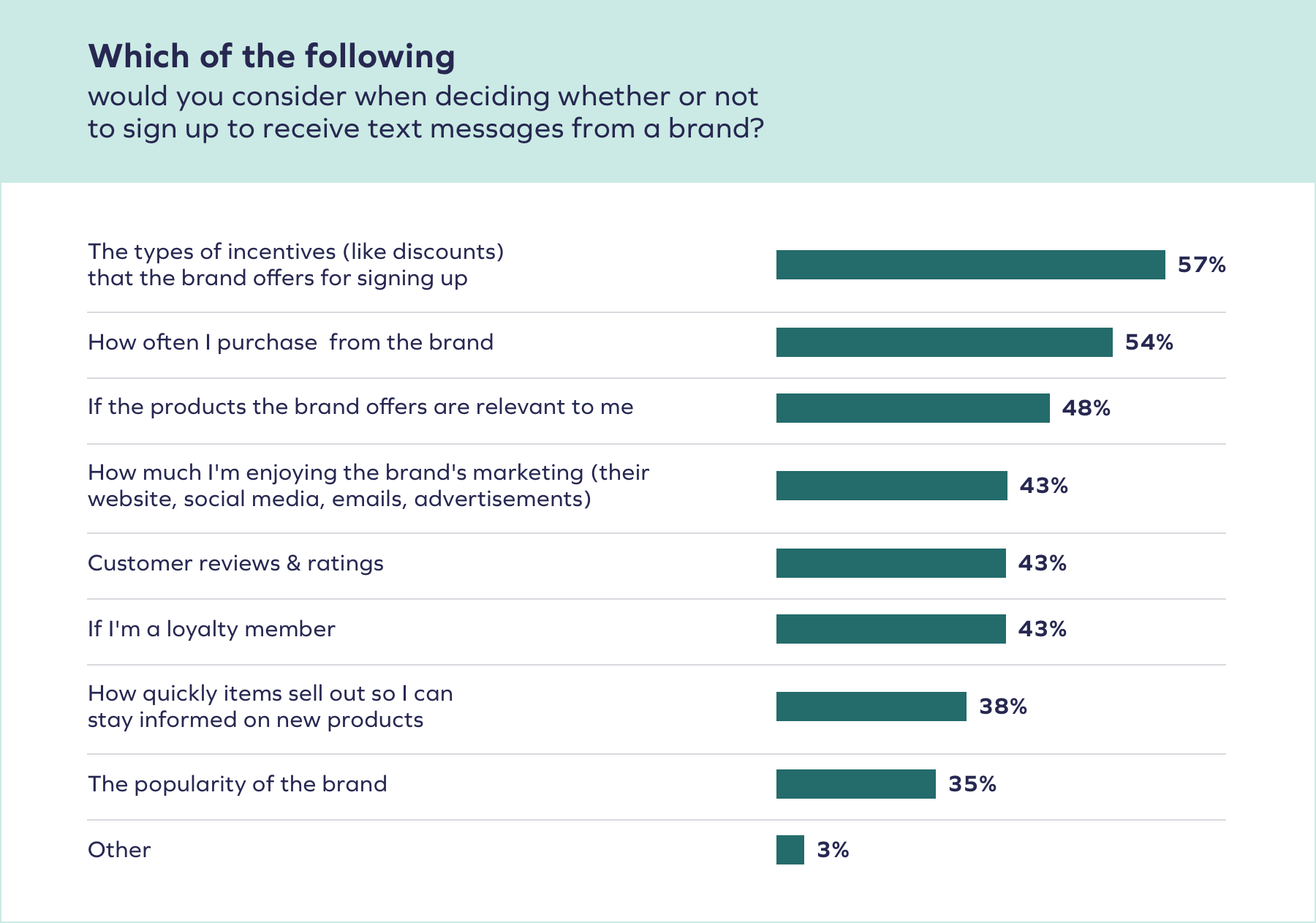 If you are not sure which channel to use for which message, you don’t have to guess which is best — let your subscribers decide. Send a text to ask them which messaging interests them the most, so you can segment accordingly. Consider prioritizing SMS for messages of high urgency that your customers need and want to know, like order status updates or limited time offers — 40% of shoppers said a text with a countdown to when a sale or offer expires would encourage them to complete a purchase.