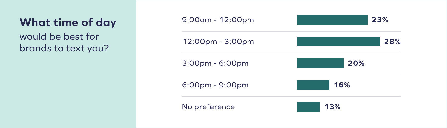 Unless your message is automatically triggered by a customer’s action (like their latest purchase), we recommend delivering the bulk of these messages within the early afternoon to late afternoon hours, when you won’t be too disruptive to your customer’s morning or nighttime routines. If you have customers in different locations, make sure to text them according to their time zones so you can stay as true to this as possible.