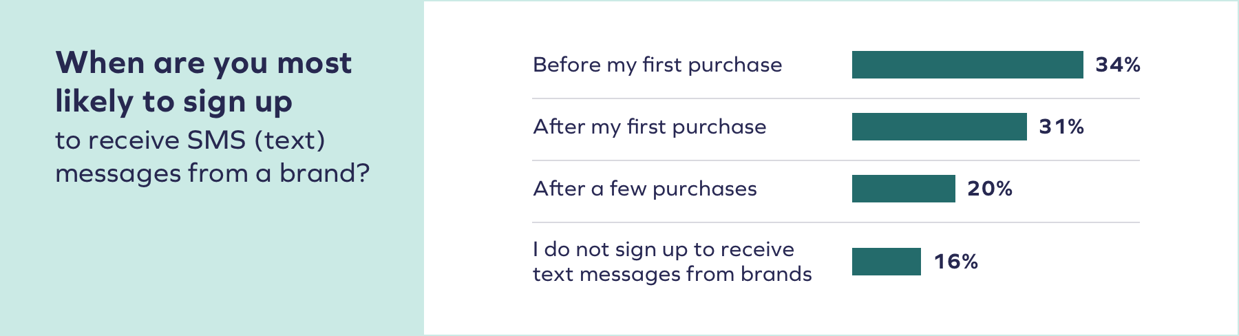With these two different channels comes the opportunity for different content. 36% of shoppers would sign up for both email and SMS because each channel has its own exclusive offers — so don’t just copy and paste what you wrote in that email into your next text. Because of the brief and conversational nature of text messages, brands can take a more casual, fun, and personal approach to text messaging while still maintaining your unique brand voice.