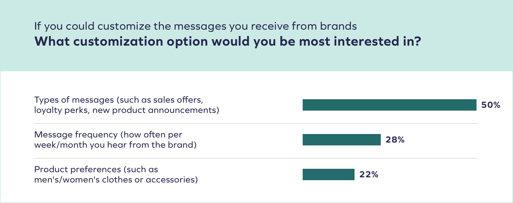 To further tailor your texts to your customers’ preferences, ask your SMS subscribers about their interests and give them options. What products are they considering, or do they want to hear more about? What types of messages would they like to receive from your brand? Not only will you learn more about your customers through this zero-party data, but you will also create a more personalized experience for every shopper, helping you to nurture the customer relationships your brand hopes to build.