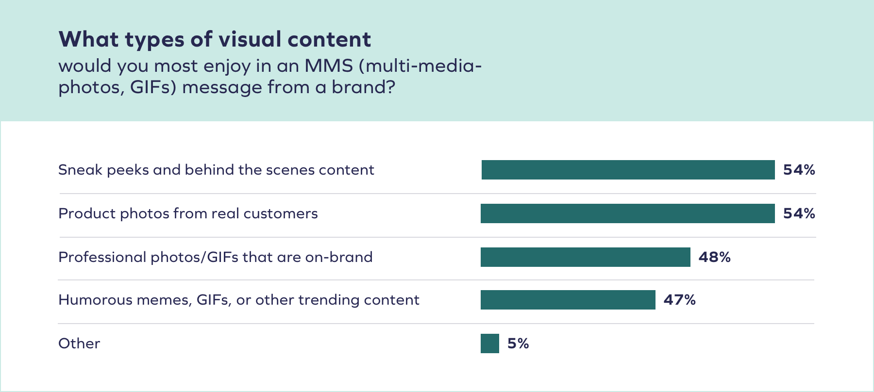 Visual content is great for engagement too. Mix up your SMS and MMS messages, and include unique and exclusive visuals that will inspire subscribers to shop. If you are thinking of sending a product cross-sell or up-sell, try using a photo or video that another customer shared in a past review. If you want to promote your upcoming collection, include teasers or behind the scenes snapshots for a sneak peek they won’t get anywhere else.
