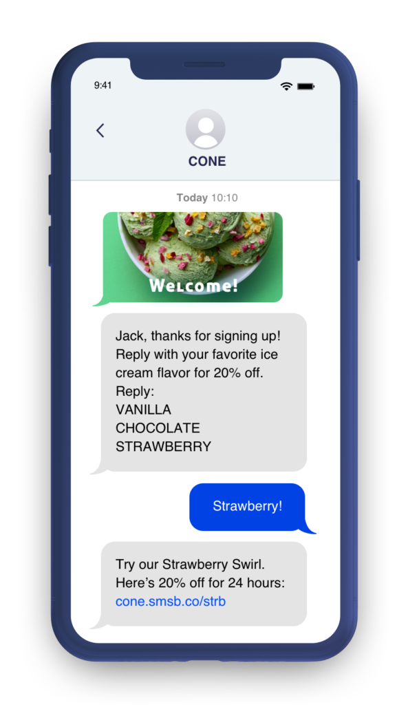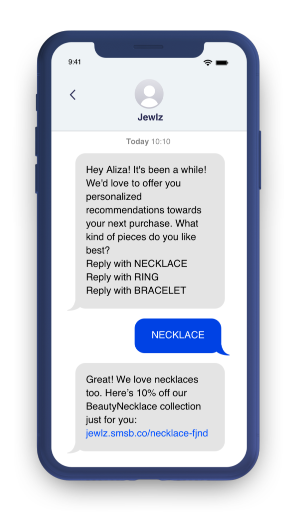 When you make a first-time sale or acquire a new SMS subscriber, an SMS welcome series is an effective way to get to know your customer. You can use a welcome flow to ask about their preferences, which will give you some extra data points for personalizing future communication, which helps boost loyalty, retention, and CLTV. It’s also a good time to extend an offer to incentivize a purchase.