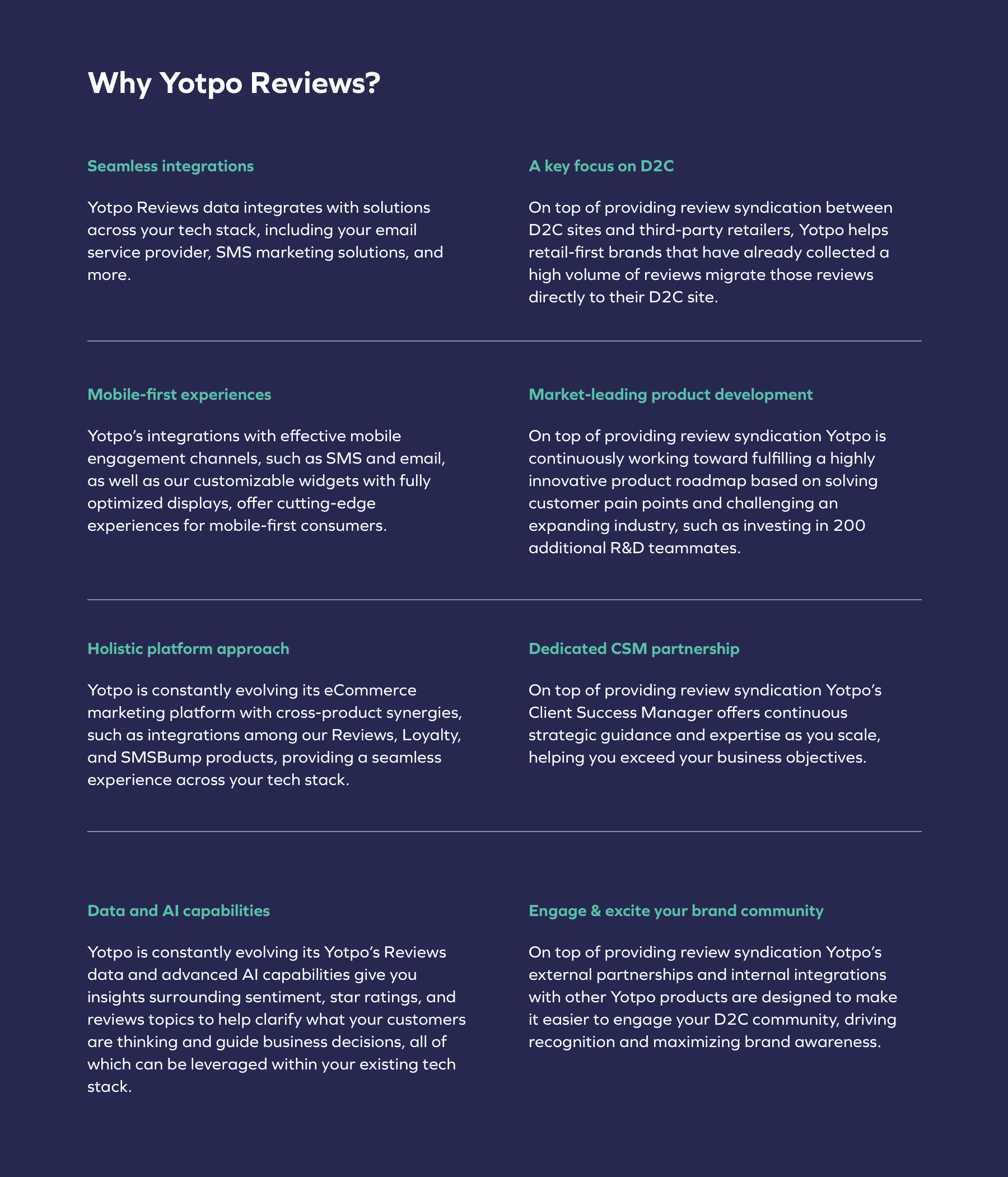 The Yotpo Reviews team is here to support your business as you navigate creating the ultimate customer journey for your brand. Click here to schedule a call with us.